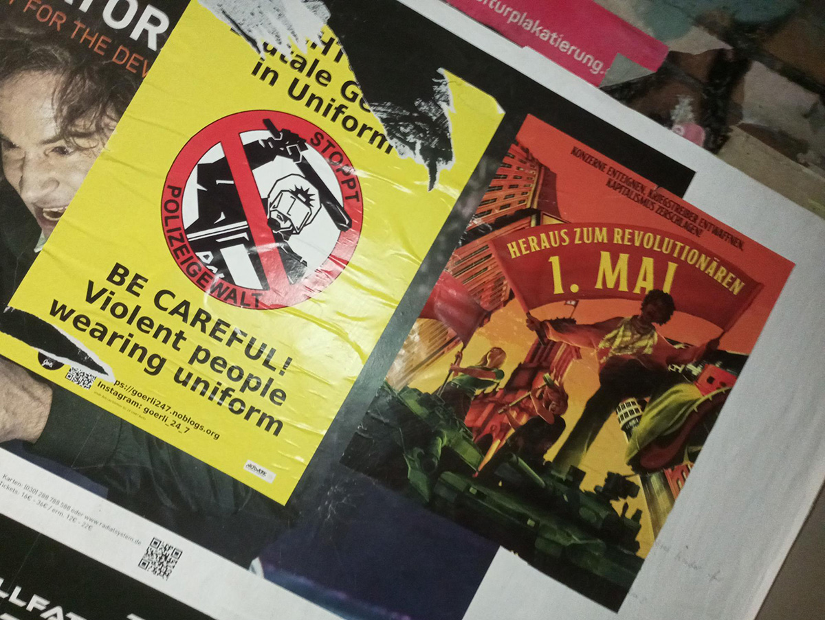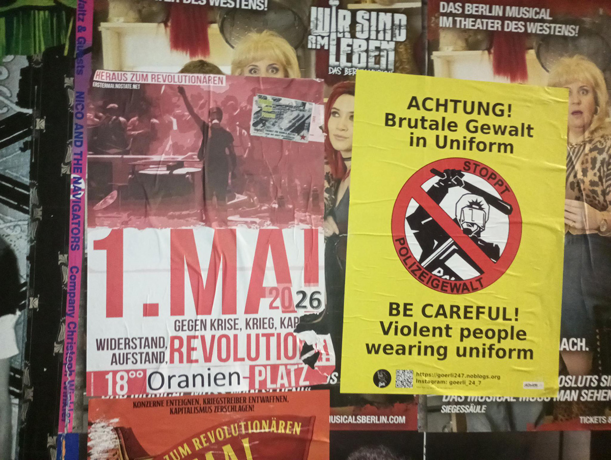 Genoss*innen haben offensichtlich Recycling bzw. Upcycling von aus alten Zeiten übrig gebliebenen Plakaten des Revolutionären 1. Mai betrieben, indem sie Jahreszahl, Uhrzeit und Ort mit Oldschool Papier- und Klebestift-Technik auf den aktuellen Stand für 2026 gebracht haben.