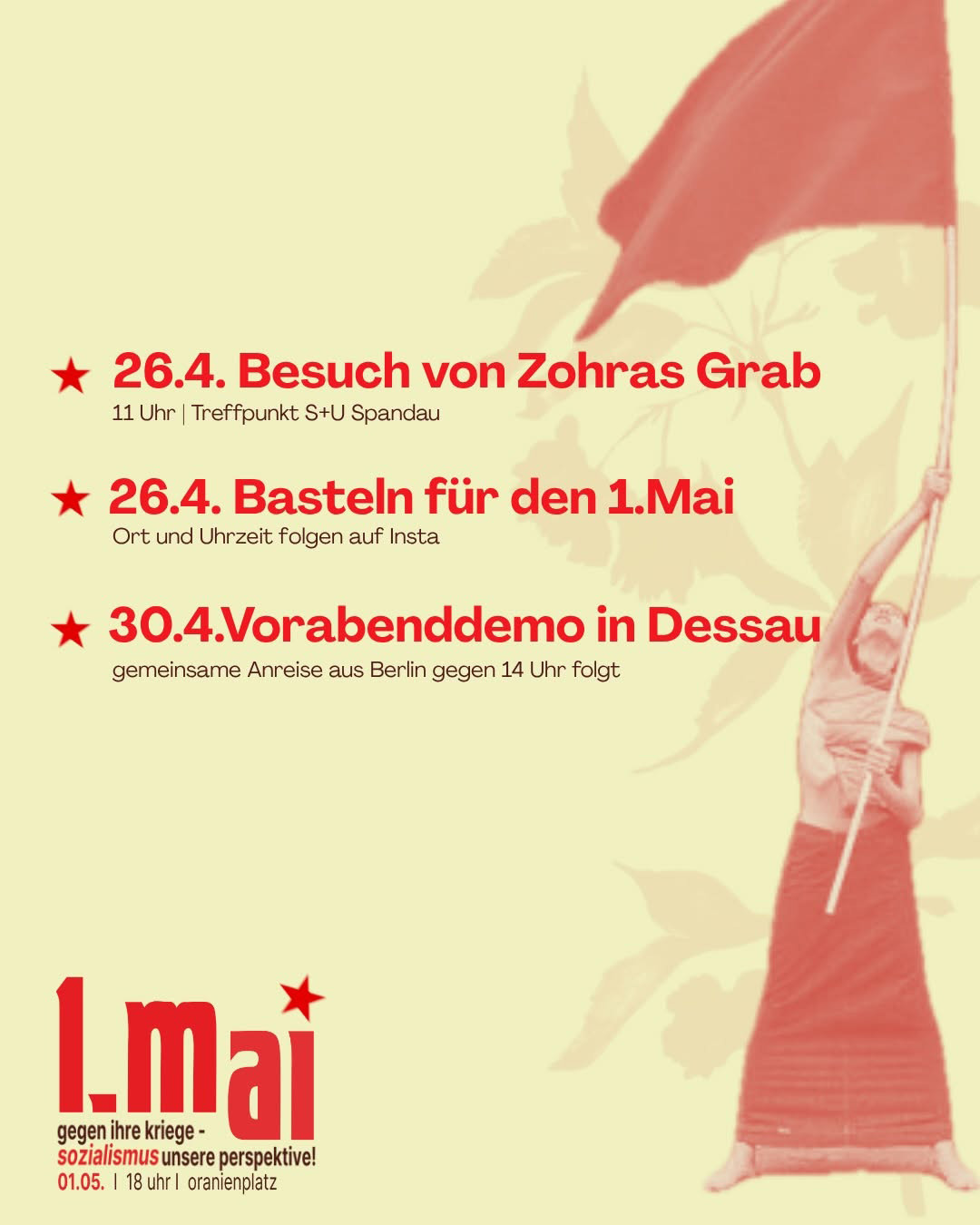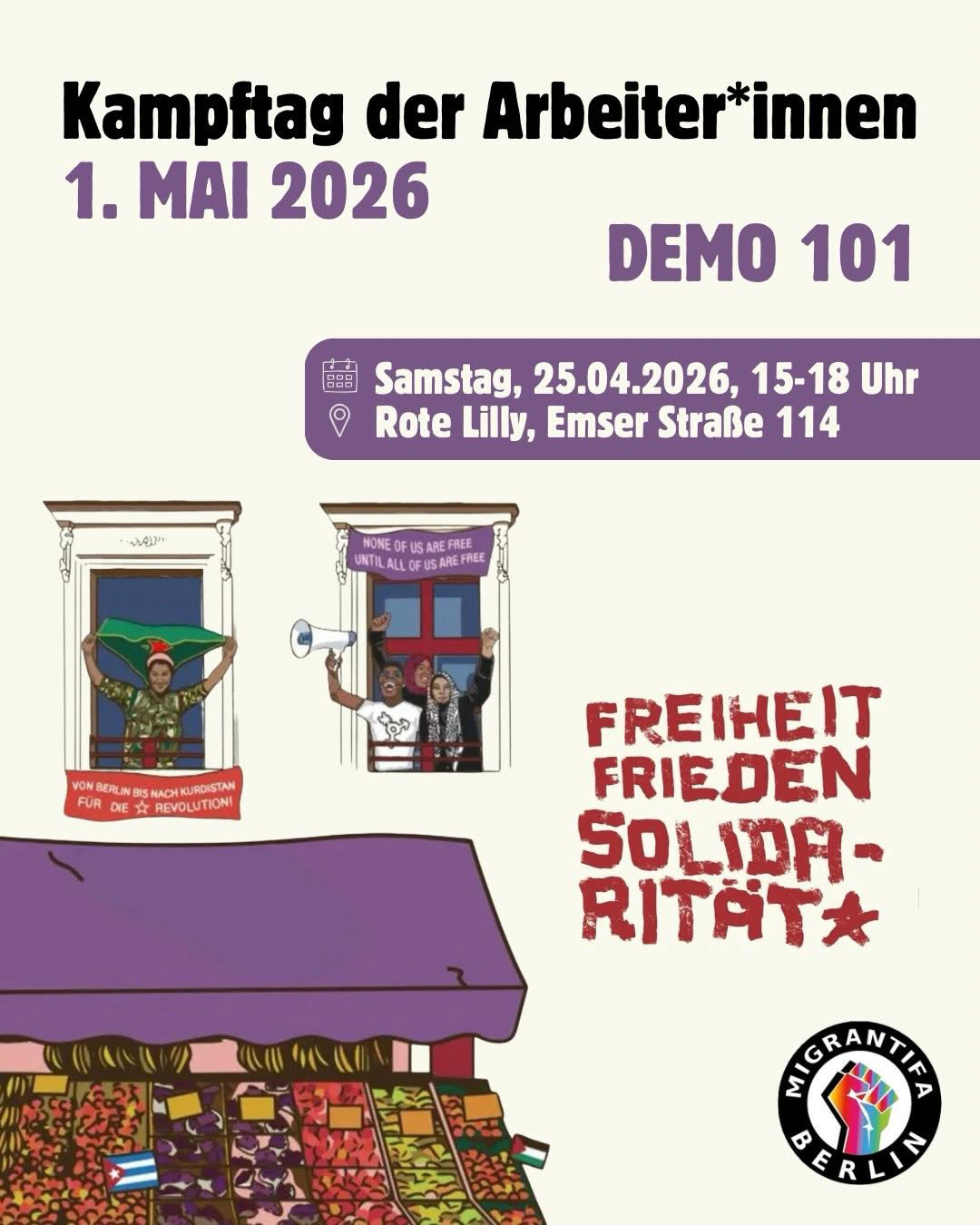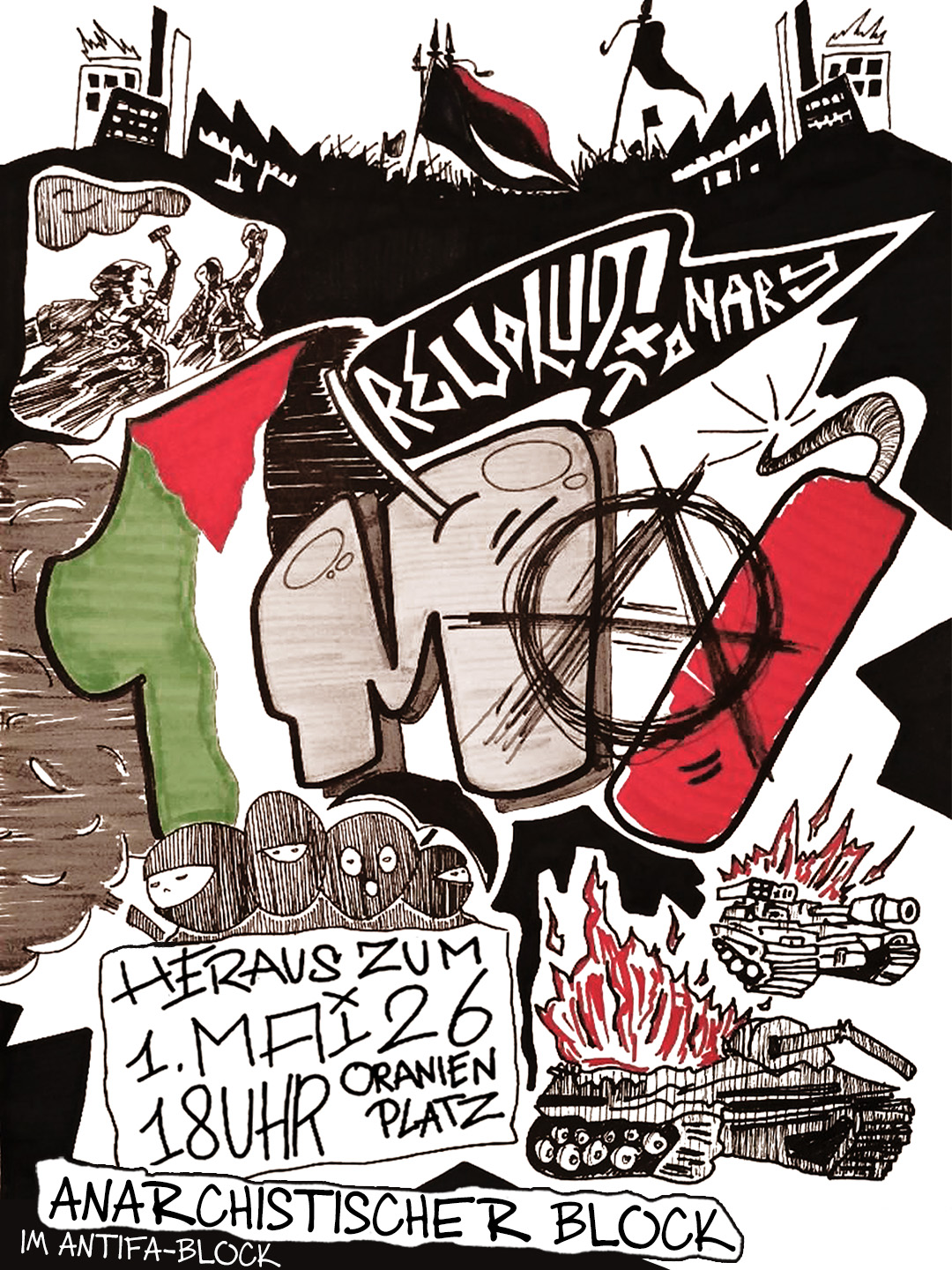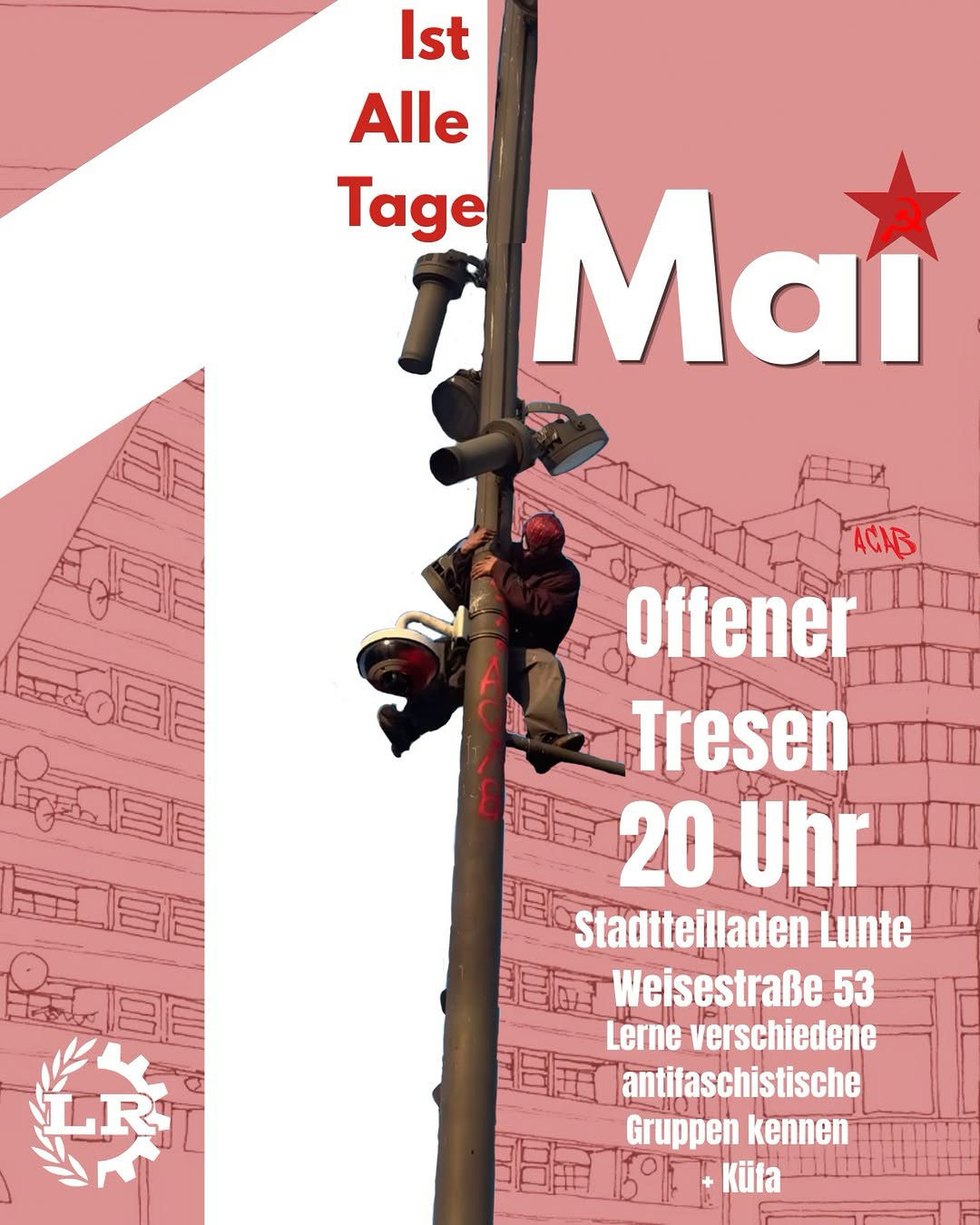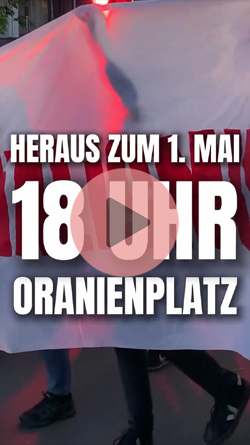 Wir rufen außerdem auf am Abend zur Revolutionären 1.-Mai-Demo zu kommen um 18 Uhr am Oranienplatz